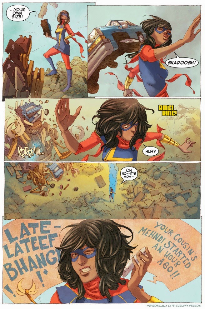 Thanks to Samantha for sending me something that I would not necessarily read on my own. 2014 has been an interesting year for women in comics, and I must admit that a lot of the new series to emerge are not ground-breaking or intelligent in their discussion of gender and are in fact somewhat irresponsible in their lessons. However, Ms. Marvel is the exception to the trend.