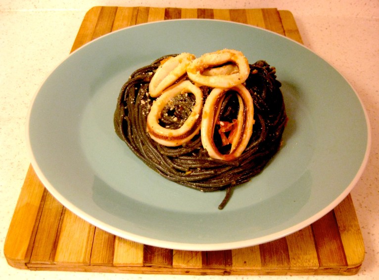 Lily and I have just returned back from Italy…Rome, Naples, and Capri to be exact and in our overloaded bags we brought back beautiful squid ink spaghetti from Naples! So, with that in tow, I decided to make my take on Pasta al Nero di Seppia con Calamari e Pomodoro (Squid Ink Pasta With Squid and Tomatoes). This is an awesome dish that should only take about 40 minutes from prep to plate.