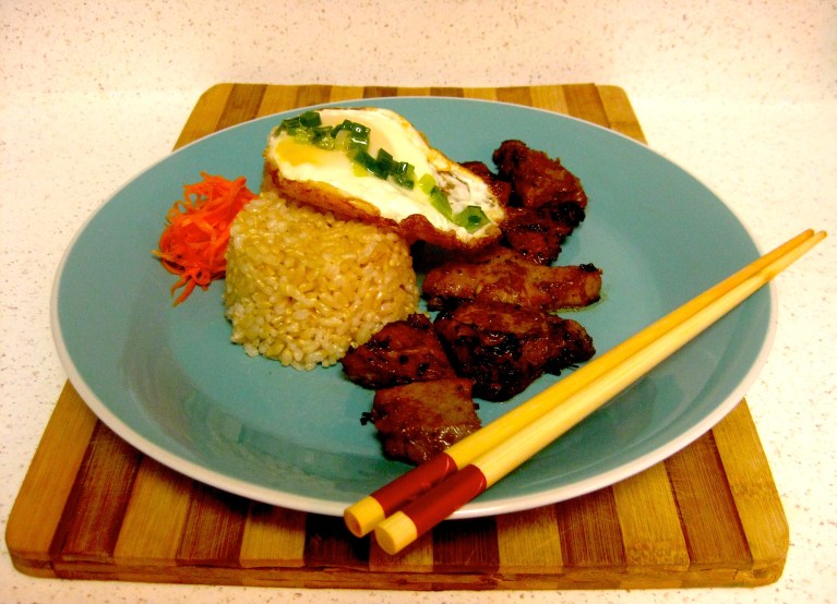 First, in my version, I use molasses as my source of color and caramelization to the meat. You can certainly use brown sugar if you would like! I also use pork without the bone; again, this is a preference. I also serve the pork with brown rice, which is a bit healthier, and this dish needs all of the help it can get when it comes to health. In addition, I serve my Com Tam without nuoc mam (the signature lime and fish sauce based dipping sauce); I let the pork marinade shine on its own but balance the richness of the dish with pickled carrots. Lastly, I pan fry my pork, whereas most preparations call for grilling or broiling. I like the texture of the pan fry myself, but you are welcome to broil or grill the Suon Nuong!