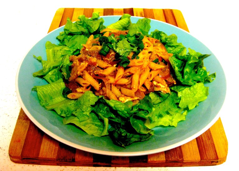 When I was a kid and teenager, I loved Nui Xao Bo, a Vietnamese interpretation of pasta. Generally made with tomato paste, I wanted to make a version that was similar to the version I had as a child but without the acidity and harshness of tomato paste. Consequently, I opted to make a tomato sauce inspired by Generoso’s techniques as the primary sauce for the pasta. In addition, I used Italian pasta instead of Vietnamese pasta, which is a personal preference. The outcome is a rich and delicious meal that I lighten with a bed of lettuce and fresh cilantro and scallions.
