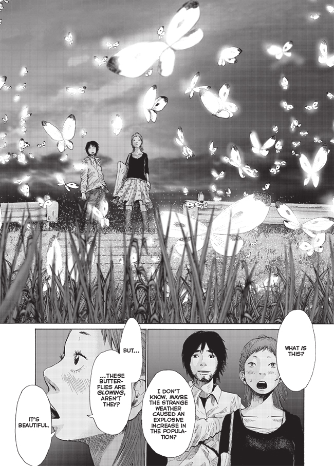 Opening with butterflies, a boy walking on the exterior of a school, and then a young man speaking about his ill father and the merging of reality and dreams to an elderly man whose face we cannot see, Nijigahara Holograph immediately distinguishes itself from what the West generally expects from manga. Expect no adolescent scantily clad women here; in fact, leave any hope for romance or lost love or even any bit of catharsis at the door. The world of Nijihara Holograph is severe, bleak, and unforgiving, and every single character suffers for his or her own actions or for the sins of others. This is not a read for the faint of heart.