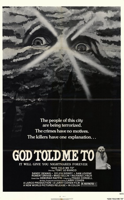 Cohen wrote, produced, and directed God Told Me To, which is centered on Catholic NYC Police Detective Peter Nicholas (Tony Lo Bianco), a well intentioned, sad sack cop who is investigating a series of random murders where the only constant is that the killers’ last utterance, which is the title of this film. If this supposedly God-inspired bloodbath doesn’t play with his Catholic guilt enough, Peter is in a severely dysfunctional open relationship between his wife of many years, Martha (the always sullen, Sandy Dennis), and his younger girlfriend, Casey (Deborah Raffin). The setup is good for a classic Italian Roman Catholic meltdown, which brings up a point that I have wondered about for years and regretfully neglected to ask Cohen that night at the Egyptian: “Why would you cast Italian-American actor Tony Lo Bianco to play essentially an Italian-American archetype but named that character Peter Nicholas?” Nicholas’s self-tormenting persona is quite similar to Mean Streets’ Roman Catholic repressed Charlie (Harvey Keitel), but as Mean Streets was released only a few years earlier, perhaps Cohen changed the character’s nationality to avoid comparison, which is almost unavoidable given the Catholic setup and its NYC location. It doesn’t change how much I appreciate this film in any way, but it does need mentioning if not for the one chance that I can face Cohen in the future without turning into a thirteen year old fan.