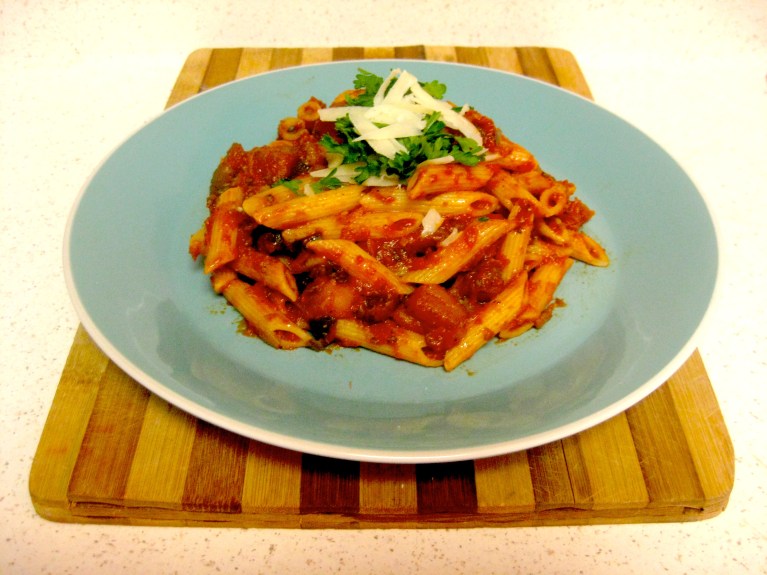 Here’s what you will need to make this dish happen: One box of penne pasta, one can of puree tomatoes, one large eggplant, olive oil, a dozen olives, 6 ounces of hard romano cheese, fresh parsley, fresh thyme, salt, and pepper.
