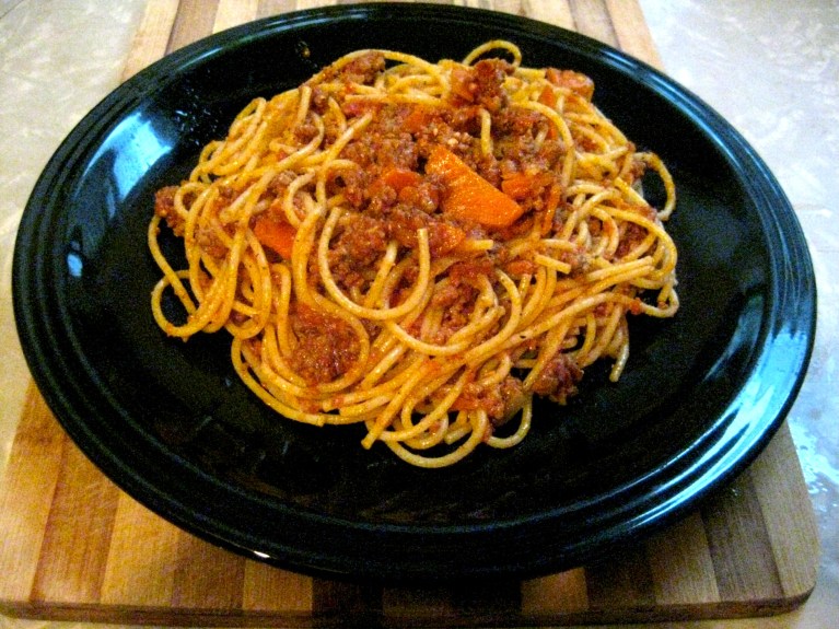 This dish is a must in the Fierro household as Lily has admitted on many an occasion that she “could and will eat this several days a week without a complaint.”  This class Italian dish of course comes from Bologna and its first appearance is said to be around 1891.  Spaghetti Bolognese first made its appearance here in Somerville for Lily in 2011, and it has been a blast to make ever since.  It is a fast dish (taking less than 2 hours to make from prep to plate) and you will only need the following ingredients to make more than enough for six people: Two boxes of spaghetti, one pound of fatty ground pork, one pound of fatty ground beef, four large carrots, a can of tomato puree, a bulb of garlic, salt, pepper, oregano and olive oil.    No need to write this down, I will show you how to make this step by step below.  Let’s me know how yours has come out!  Music from Giulio Regondi’s “Etude no. 6” and then Tommaso Giordani’s “Guitar Sonata in Cm.”