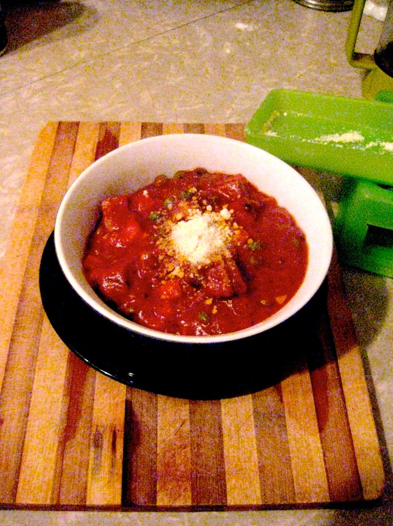 Here’s what you will need: 1 pound of squid ink spaghetti, 1/2 pounds of raw squid. 4 roma tomatoes, 6 big bulbs of garlic, 1/2 cup of white wine, extra virgin olive oil, two sprigs of thyme, 1 teaspoon of red pepper flakes, 1/2 cup of grated romano cheese, salt and pepper.